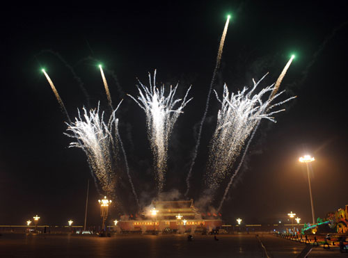 Fireworks explode over Tiananmen Square during the opening ceremony of Beijing 2008 Paralympic Games at the National Stadium, September 6, 2008.[Xinhua]