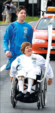 Libby Kosmala accompanies the torch attached to her wheelchair through Adelaide for the Sydney 2000 Olympic Games with escort runner Luke Garnaut giving a helping hand. [Agencies]