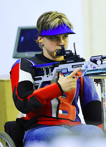 Slovakia's Veronika Vadovicova competes in the women's 10-meter air rifle standing SH1 fina. Veronika Vadovicova won the Beijing Paralympics' first gold medal September 7, 2008. [Xinhua]