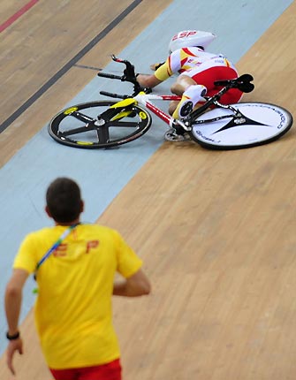 A trainer rushes to assist Maurice far Eckhard of Spain after he fell following his race with Jean Quevillon of Canada in the men's individual pursuit (CP3) cycling track competition during the 2008 Beijing Paralympic Games on September 7, 2008 at the Laoshan Velodrome. [Agencies]