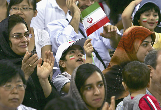 An Iran fan (C) waves the national flag as she cheers for the Iranian team during their men's sitting volleyball preliminaries Group B match against Japan at the Beijing 2008 Paralympic Games September 7, 2008. [Agencies]