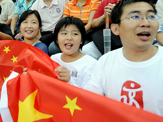Three Chinese spectators wave the Chinese national flag as they cheers for the Chinese Paralympians at the Beijing 2008 Paralympic Games September 7, 2008. [Xinhua]