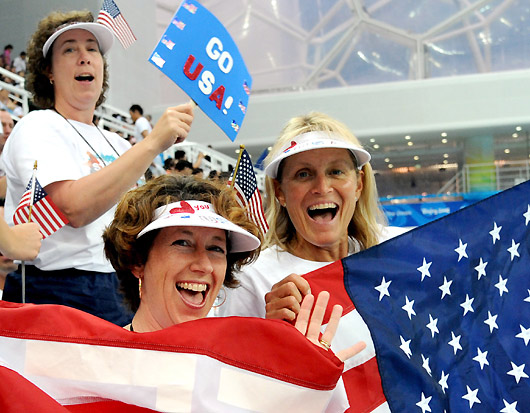 US spectators wave American national flag to cheer for the competitors at the National Aquatics Centre, also known as the Water Cube, in Beijing September 7, 2008. [Xinhua]