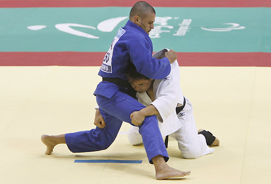 Li Xiaodong of China (in white) fights Helder Araujo of Brazil during their men's 60kg preliminary judo match at the Beijing 2008 Paralympic Games September 7, 2008. [Agencies]