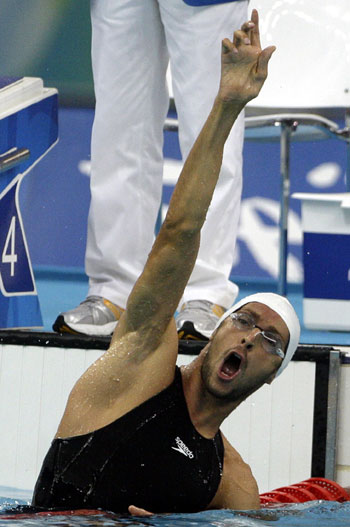 France's David Smetanine reacts after winning the men's 100m Freestyle S4 final at the National Aquatics Centre, also known as the Water Cube, in the Beijing 2008 Paralympic Games September 7, 2008. [Agencies]