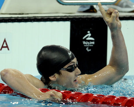 Rudy Garcia Tolson of the US celebrates after winning the men's 200m individual medley sm7 final during the 2008 Beijing Paralympic Games at the National Aquatics Center in Beijing on September 7, 2008. [Agencies]