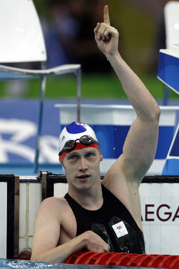 Sascha Kindred of Britain celebrates after winning the men's 200m individual medley SM6 final at the National Aquatics Centre, also known as the Water Cube, in the Beijing 2008 Paralympic Games September 7, 2008. [Agencies]