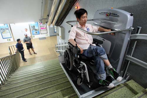 A worker tests the wheelchair-lifting platform at the Chegongzhuang Subway Station in Beijing, June 19, 2008. The wheelchair-lifting platform and barrow for upstairs have been installed at the subway stations in Beijing by July, 2008. [Xinhua]
