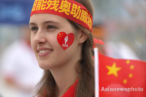 A foreign spectator waves Chinese national flag outside the National Stadium, or Bird's Nest, at the Beijing Paralympics, September 8, 2008. [Asianewsphoto]