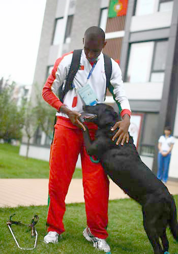 A blind Portuguese athlete plays with his guide dog "Nida" at the Beijing Paralympic Village, September 8, 2008. [Sohu.com]