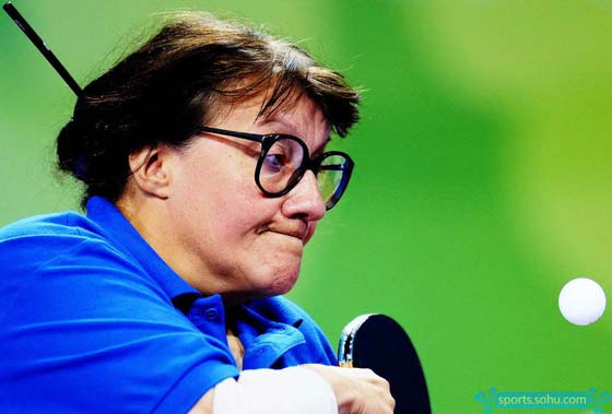 Britain's Cathy Mitton serves in the table tennis Women'sIndividual - Class 1/2 Group C competition during the Beijing Paralympic Games, September 8, 2008. [Sohu.com]