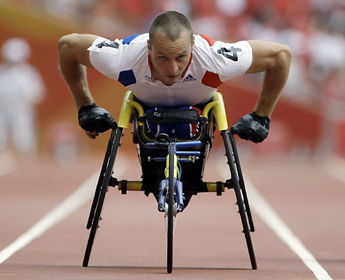 Julien Casoli of France competes in his heat of the men's 400m T54 at the National Stadium, also known as the Bird's Nest, at the Beijing 2008 Paralympic Games September 8, 2008. [Agencies]