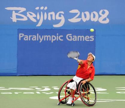 Chinese wheelchair tennis player Dong Fuli trains during the 2008 Beijing Paralympic Games on September 7, 2008.[Xinhua]