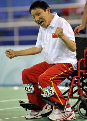 Chinese boccia player Wang Yi celebrates after he defeated Padraic Moran of Ireland 6-5 in the quarterfinals of Mixed Individual BC1 and enter the semifinals of the sport. [Xinhua]