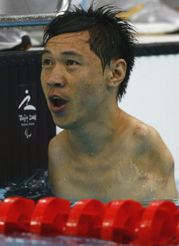 China's defending champion He Juquan looks at his marks at the finishing line after the men's 50m backstroke S5 preliminary Sept. 8, 2008. [Xinhua]