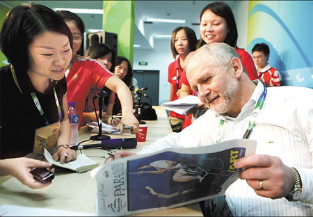 International Paralympic Committee President Philip Craven reads a copy of The Paralympian, the official publication for the Games and published by China Daily, during an interval in the judo event at the Workers' Gymnasium in Beijing. [China Daily]