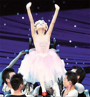 Li took part in a ballet performance of Ravel's Bolero. She was trapped for more than 70 hours when her school in Beichuan collapsed in the May 12 quake. One of her legs had to be amputated.