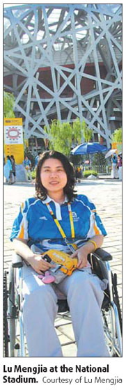 Lu is one of three wheelchair volunteers at the National Stadium.