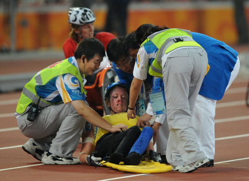 Gunilla Wallengren of Sweden is helped by medical staff after crashing out in the final of the women's 5000 metre T54 classification race at the 2008 Beijing Paralympic Games in Beijing on September 8, 2008. Diane Roy of Canada won the race with Shelly Woods of Great Britain second and Amanda McGrory of the US third. [Agencies]