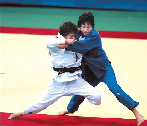 Germany's Ramona Brussig (right), the younger twin, competes against Algeria's Mounia Karkar in their semifinal bout of the women's 57kg judo event. Ramona won the bout to enter the final where she won silver. [China Daily]