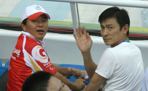 Hong Kong singer and actor Andy Lau, who sings the Paralympics theme song "Flying with the Dream," enjoys the action at the Water Cube during the Beijing Paralympic Games on September 8, 2008. [Sohu.com]