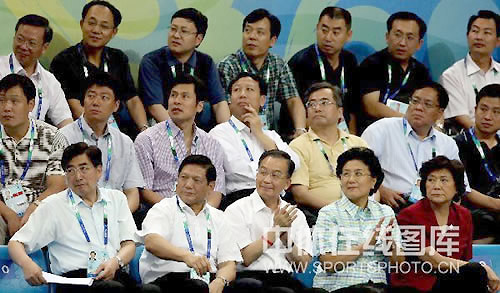Chinese premier, Wen Jiabao, wearing a volunteer wristband, enjoys the swimming at the National Aquatics Center on September 8, 2008. [sportsphoto.cn]