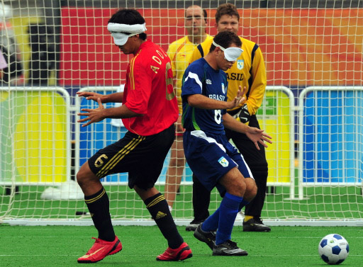 Brazil's Marcos Felipe (R) vies for the ball with Spain's Samuel Adolfo Acosta (L) in front of Brazil goalkeeper Fabio Vasconcelos Ribeiro (rear) in their men's 5-a-side football match during the 2008 Beijing Paralympic Games on September 9, 2008 at the Olympic Green hockey field in Beijing. Brazil defeated Spain 1-0 in a sport where each team fields four blind players and one sighted or visually impaired goalkeeper. [Agencies]