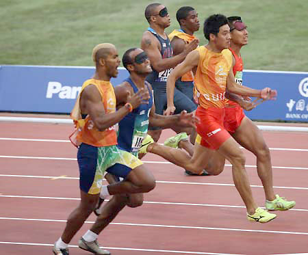 Brazil's Lucas Prado (L2) competes during the first round competition of men's 100m T11 at the National Stadium, also known as the Bird's Nest,at the Beijing 2008 Paralympic Games in Beijing, China, Sept. 8, 2008. [Xinhua]