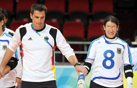 The German goalball coach supports a player during a preliminary match on September 8,2008. [Xinhua]