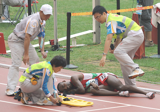 Jose Monteiro of Portugal is tended to by volunteers after collapsing at the finish line during the heats of the men's 1,500 metre T46 clasification event at the 2008 Beijing Paralympic Games in Beijing on September 9, 2008. [Agencies]