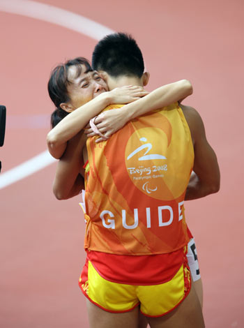 Wu Chunmiao of China (facinng camera) hugs her guide (R) after she wins gold in the final of the 100m T11 final A during the 2008 Beijing Paralympic Games at the National Stadium in the Chinese capital on September 9, 2008. [Xinhua]