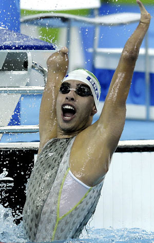 Brazilian swimmer Daniel Dias celebrates after winning the men's 50m backstroke S5 final during the 2008 Beijing Paralympic Games at the National Aquatics Center in Beijing on September 8, 2008. [Agencies]