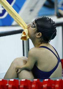 Jiang blew the roof off the Water Cube when she led the lanes most of the time but only to be overtaken 25 meters from the wall by a swimmer from the Netherlands. Jiang lost the gold, but touched a lot of hearts.