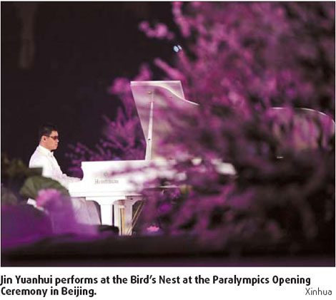 In 2004, Jin and other five members of the China Disabled People's Performing Art Troupe performed at the closing ceremony of Athens Paralympics. This time, he played solo and performed Fantasy Impromptu by Chopin.