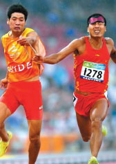 Chinese Paralympic runner Liu Xiangkun and his guide, Chen Liang, compete on their way to a fourth-place finish in the men's 100m T11 final yesterday. Lucas Prado of Brazil won the gold. [Xinhua]