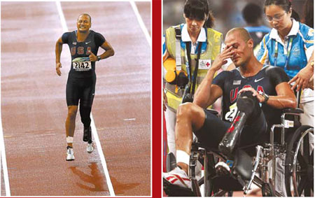 The photo sequence shows US sprinter Marlon Shirley (Top) running alongside compatriot Brian Frasure in the final of the 100m T44 September 9, 2008; tripping and falling over; picking himself and resuming his run; and being attended to by volunteers. [AFP/ Xinhua/CNS/AP]