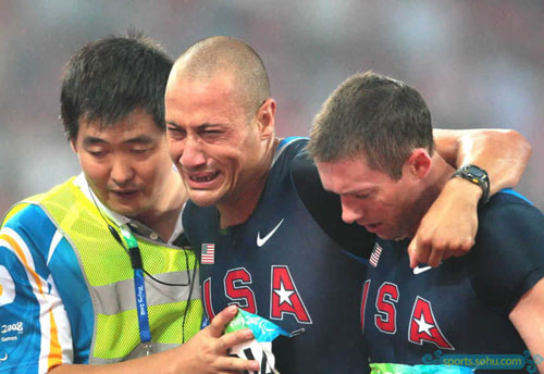 Marlon Shirley (C) of the US is helped by teammate Brian Frasure (R) and an official after he fell in the final of the 100m T44 during the 2008 Beijing Paralympic Games at the National Stadium in the Chinese capital on September 9, 2008.[Sohu.com]