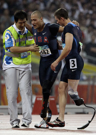 Marlon Shirley (C) of the U.S. is assisted off the track by compatriot Brian Frasure (R) and an official after falling during the Men's 100m T44 final at the National Stadium, also known as the Bird's Nest, during the Beijing 2008 Paralympic Games September 9, 2008.[Agencies]