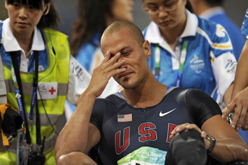 | Marlon Shirley (C) of the US is helped off the track after he fell in the final of the 100m T44 during the 2008 Beijing Paralympic Games at the National Stadium in the Chinese capital on September 9, 2008.[Agencies] |