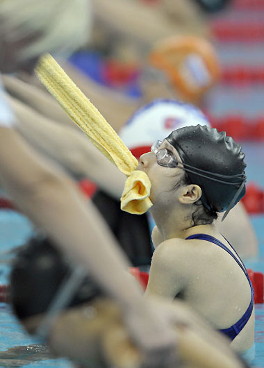 Jiang Fuying of China gets help by grabbing part of a towel to start in the women's 100m backstroke S6 final at the National Aquatics Center during the 2008 Beijing Paralympic Games September 9, 2008. [Agencies]