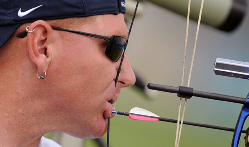 US archer Eric Bennett pulls the arrow back with his teeth during the competition of the 2008 Paralympic Games on September 9, 2008. [Xinhua]