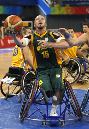 South Africa's Richard Nortje (15) shoots past Sweden's players during the men's wheelchair basketball preliminaries Group A match at the Beijing 2008 Paralympic Games September 10, 2008. [Agencies]