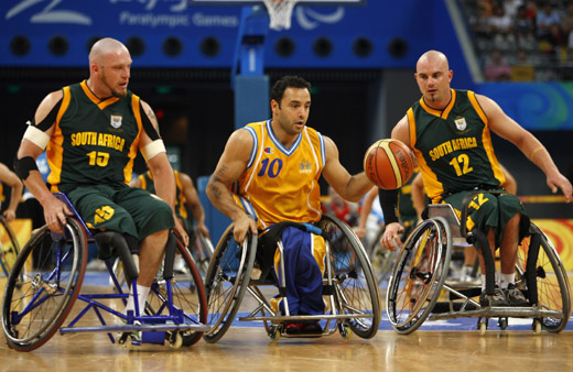 Sweden's Hussein Haidari dribbles past South Africa's Richard Nortje (15) and David Curle (12) during the men's wheelchair basketball preliminaries Group A match at the Beijing 2008 Paralympic Games September 10, 2008. [Agencies]