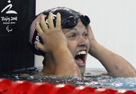 Erin Popovich of the US celebrates winning the women's 100m breaststroke SB7 finals during the Beijing 2008 Paralympic Games September 9, 2008. [Agencies]