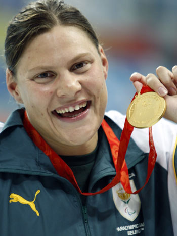 South Africa's Natalie Du Toit shows her gold medal after winning the women's 100m freestyle S9 finals at the Beijing 2008 Paralympic Games September 8, 2008. [Agencies]