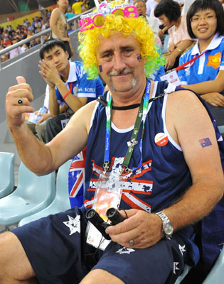 An Australian spectator poses for a picture with a thumbs-up during a cycling competition of the Beijing 2008 Paralympic Games at the Laoshan Velodrome September 10, 2008. [Xinhua]