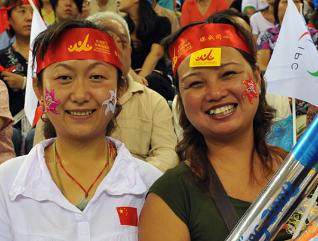 Two Chinese spectators pose for a photo during a cycling competition of the 2008 Beijing Paralympic Games at the Laoshan Velodrome September 10, 2008. [Xinhua]