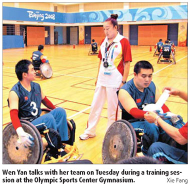 When China's wheelchair rugby team faces its first opponent - the US - tomorrow, no one will be watching more closely than "coach mom" Wen Yan.