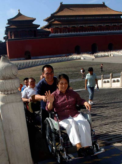At Beijing's Palace Museum,a 1,000-meter barrier-free pathway allows wheelchair visitors to go along the central axis of the palace.A group of disabled people, visits at the Palace Museum,September 10, 2008. [Xinhua]