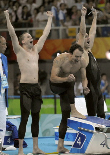 At the water cube, in the men's 4x100 freestyle relay 34pts, the British team grabbed gold in the first swimming relay event of the Games and broke the world record with a time of 3 minutes 51.43 seconds. The silver medal went to Australia and China was third.